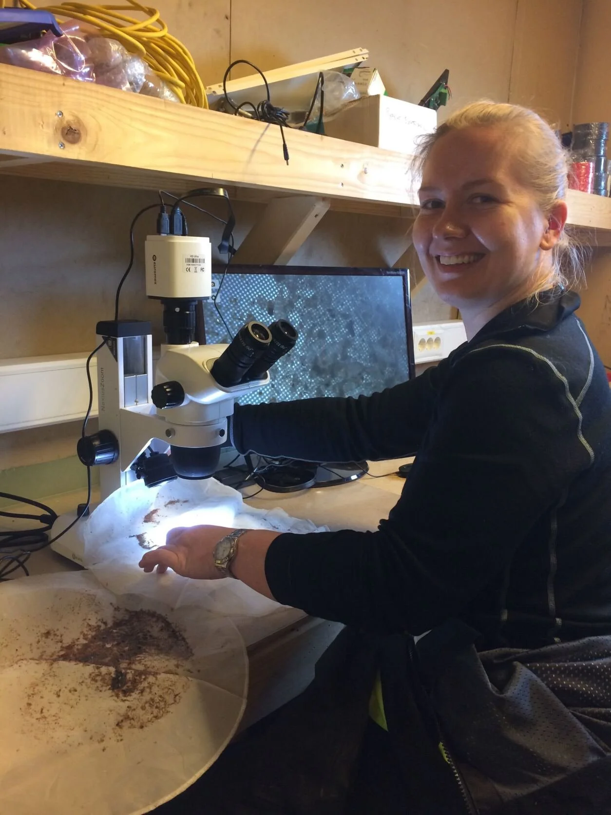Karoline inne på flåten hos Bremnes Seashore, hvor hun manuelt søkte etter lakseluslarver med mikroskop.
